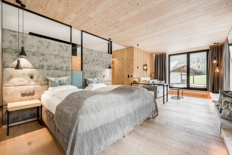 Our rooms and suites are thoughtfully designed using natural Alpine materials to create a deep sense of well-being. Each room is equipped with high-quality amenities, including an in-room safe, hairdryer, flat-screen TV, and radio, alongside modern bathroom facilities. To enhance your wellness experience, we provide bathrobes and slippers plus spa bag with sauna towels, as well as our exclusive Alpine larch care products, such as shower gel and soap, specifically selected for your stay.
