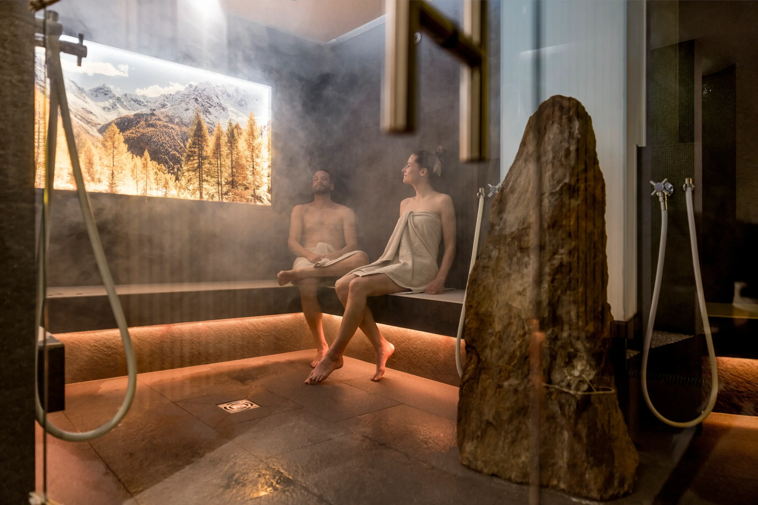 Step into our sanctuary of heat. Immerse yourself in our diverse themed saunas, where natural materials, the delicate scent of larch, and breathtaking views of the Tirolean mountains create a world of pure relaxation.