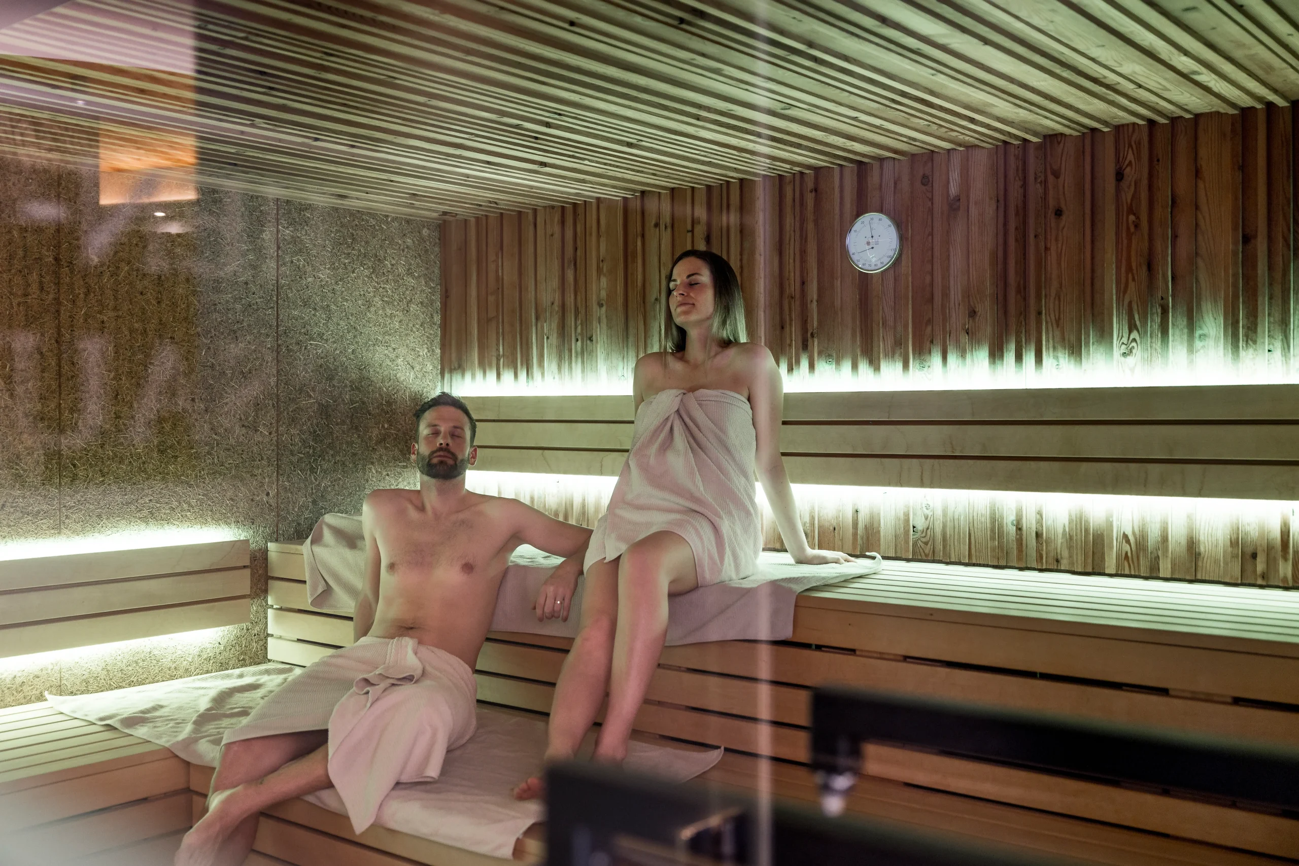 - Swimwear zones: These include the year-round heated outdoor energy pool, the natural swimming pond with its sunbathing lawn, and our dedicated relaxation rooms.